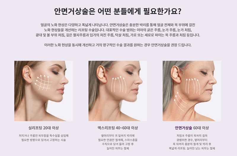 나이가 들수록 얼굴선이 무너지고, 볼살과 턱선이 아래로 처지면서 인상이 달라지는 경우가 많습니다. 이럴 때 단순한 피부 탄력 관리만으로는 원하는 효과를 얻기 어려워지는데요. 이러한 고민을 근본적으로 개선할 수 있는 방법이 바로 안명거상술입니다. 안면거상술은 단순히 피부를 당기는 시술이 아니라 피부 근막층(SMAS층)까지 리프팅하여 얼굴의 탄력을 되찾는 수술입니다. 피부만 당기는 리프팅과는 달리, 근본적인 처짐 원인을 개선하기 때문에 효과의 지속력과 자연스러움이 큰 장점이에요. 1. 피부 처짐 개선 2. 팔자주름 완화 3. 턱선 정리 및 윤곽 개선 4. 동안 이미지 연출 가능 기대할 수 있는 효과는? 1. 처짐 개선 및 탄력 회복 : 볼살, 팔자주름, 턱선 부위의 전박적인 리프팅 효과를 기대할 수 있어요. 2. 자연스러운 윤곽 정리 : 인위적으로 당긴 느낌이 아니라 본래 얼굴선을 살리는 방식으로 자연스럽게 개선합니다. 3. 인상 개선 효과 : 무거워 보이던 인상이 부드럽고 또렷하게 정리되어 동안 이미지로 변화할 수 있어요. 4. 지속력 있는 효과 : SMAS층을 당겨주는 리프팅이기 때문에 다른 리프팅 시술에 비해 결과가 오래 유지되는 것이 특징입니다. 이런 분들께 추천해요. 1. 피부 처짐으로 인해 인상이 달라진 경우 2. 탄력 저하로 얼굴선이 무너진 경우 3. 단기간이 아닌 지속력 있는 리프팅을 원하시는 경우 4. 자연스럽고 정돈된 동안 효과를 기대하시는 경우 단순히 탄력 관리를 넘어, 근본적인 리프팅 효과를 원하신다면 안면거상술이 좋은 선택이 될 수 있습니다. 주의사항 및 회복 과정?! 모든 수술이 그렇듯, 안면거상술도 회복 과정과 주의사항을 잘 지키는 것이 중요합니다. 1. 붓기와 멍 : 수술 직후 일시적인 붓기나 멍이 생길 수 있으나 대부분 1~2주 내에 자연스럽게 가라앉습니다. 2. 실밥 제거 후 관리 : 일정 기간 동안은 세안, 화장 등 피부에 자극이 가지 않도록 주의가 필요합니다. 3. 흡연, 음주 자제 : 회복 속도와 결과에 영향을 줄 수 있어 수술 전후 일정 기간은 피하는 것이 좋습니다. 4. 정기적인 경과 체크 : 의료진의 안내에 따라 관리 일정을 지키는 것이 중요합니다.