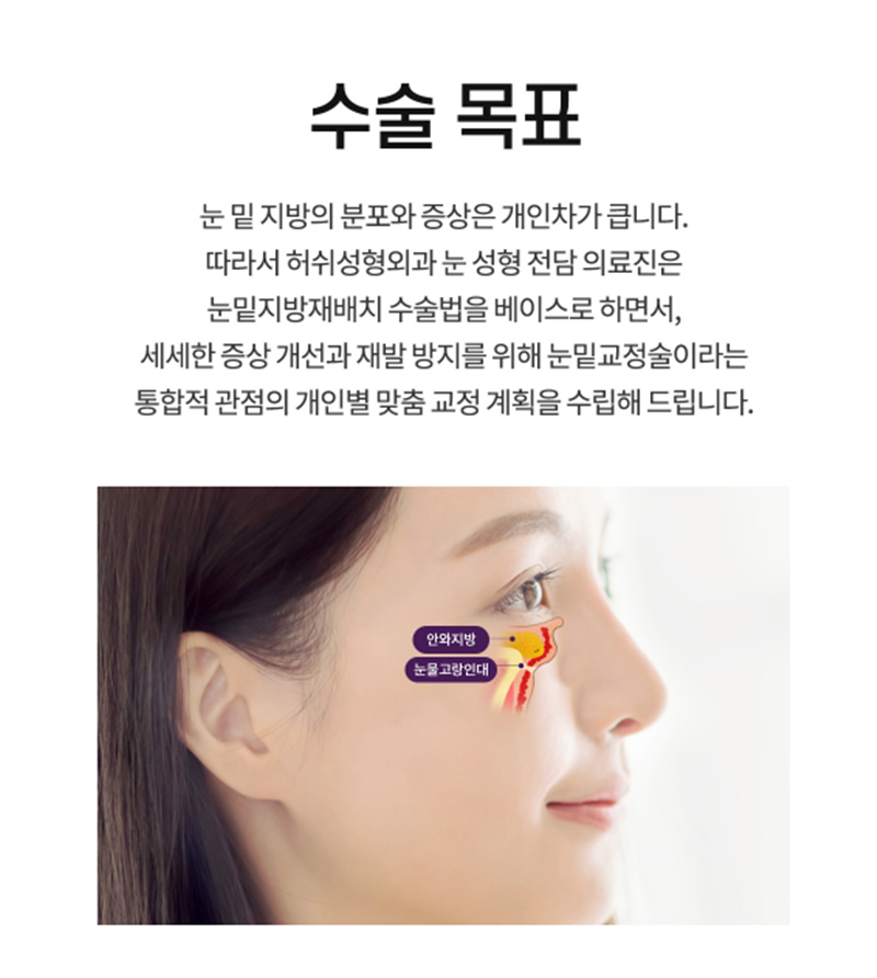거울을 봤을 때 눈 아래가 불룩하게 튀어나와 보이거나 다크서클이 더 짙어 보인다면 단순 피로가 아니라 눈밑 지방 때문일 수 있습니다. 눈밑 지방은 나이 들어 보이는 인상을 만들 수 있어 상담이 꾸준히 증가하는 부위 중 하나입니다. 오늘은 눈밑 지방이 생기는 이유와 개선 방법에 대해 자세히 정리해드립니다. 눈밑 지방이란 무엇인가요? 눈 아래에는 원래 지방이 존재합니다. 이 지방은 안구를 보호하는 역할을 합니다. 하지만 아래와 같은 이유로 지방이 앞으로 돌출되면 "눈밑 지방"으로 보이게 됩니다. 눈밑 지방이 생기는 이유? 1. 노화로 인한 탄력 저하 : 나이가 들면서 피부와 근육 탄력이 약해지고 지방을 지탱하던 구조가 느슨해지면서 지방이 앞으로 밀려 나올 수 있습니다. 2. 유전적 요인 : 20~30대 젊은 나이에도 눈밑 지방이 도드라지는 경우가 있습니다. 이 경우 유전적 구조 영향일 가능성이 있습니다. 3. 안와격막 약화 : 지방을 잡아주는 막(격막)이 약해지면 지방 돌출이 쉽게 나타날 수 있습니다. 4. 피부 얇음 + 색소 문제 : 지방이 많지 않아도 피부가 얇으면 그림자가 생겨 더 도드라져 보일 수 있습니다. 눈밑 지방이 만들 수 있는 인상 변화 1. 피곤해 보이는 인상 2. 나이 들어 보이는 느낌 3. 다크서클이 더 짙어 보임 4. 화장으로 가려지지 않는 그림자 특히 웃지 않아도 항상 그늘이 생겨 보인다면 구조적 원인을 확인해볼 필요가 있습니다. 눈밑 지방 해결 방법은? 1. 눈밑 지방이 적고 꺼짐이 동반된 경우 : 지방 돌출보다는 눈물고랑 꺼짐이 주된 원인이라면 필러 등 비수술적 방법이 고려될 수 있습니다. 단 적합 여부는 정확한 진단이 필요합니다. 2. 지방이 돌출된 경우 : 지방이 앞으로 밀려 나온 상태라면 눈밑지방재배치 또는 제거방식이 상담 대상이 될 수 있습니다. 눈밑지방재배치는 돌출된 지방을 단순 제거하는 것이 아니라 필요한 부위로 재배치해 부드러운 라인을 만드는 방법입니다. 3. 피부 처짐이 동반된 경우 : 피부 탄력 저하가 동반되면 추가적인 리프팅 접근이 필요할 수 있습니다.