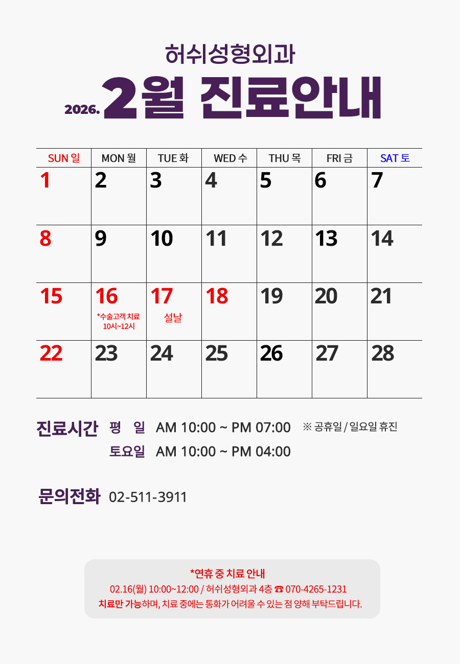 [허쉬성형외과] 2026년 2월 진료일 안내 2026-01-27 hit.729 |