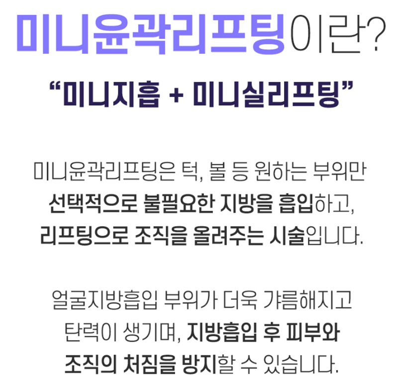 나이가 들수록 얼굴의 볼륨과 탄력은 점점 달라집니다. 불필요한 지방은 쌓이고, 피부와 조직은 아래로 처지면서 동안 이미지를 해치는 원이이 되죠. 특히 턱 라인, 볼살, 팔자 등.. 운동이나 생활습관으로 쉽게 개선되기 여려운 경우가 많습니다. 이럴 때 도움이 되는 방법 중 하나가 바로 "미니윤곽리프팅"이에요. 간단히 말해! 불필요한 지방을 흡입하고 동시에 처진 조직을 리프팅하는 방식으로 윤곽 라인을 보다 또렷하고 탄력 있게 정리해주는 시술이죠. 미니윤곽리프팅이란 얼굴에서 필요한 부분만 선택적으로 접근해 턱선, 팔자 주름, 이중턱, 볼살 등.. 불필요한 지방을 흡입하고 흡입 후 느슨해진 피부와 조직을 실 리프팅으로 당겨 탄력을 강화하는 즉! 작은 윤곽 수술처럼 얼굴선을 정리하면서도 회복은 빠른 시술이라고 볼 수 있습니다.