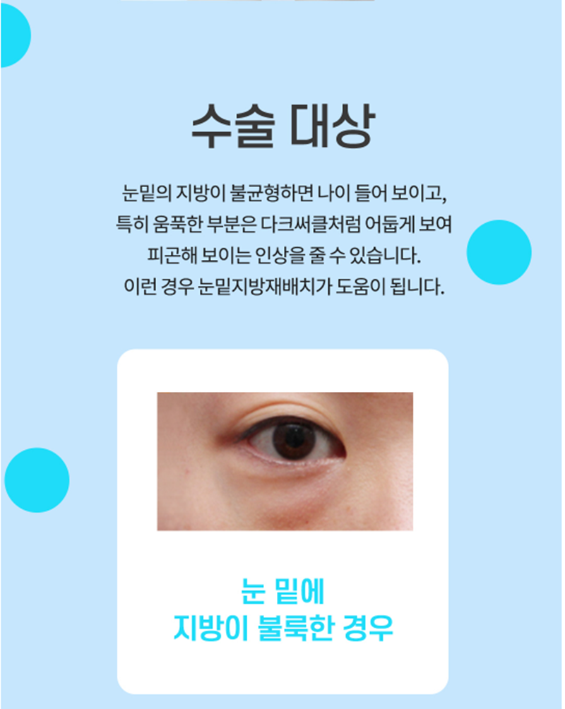 눈밑지방재배치, 알아두면 좋은 정보 오늘은 눈밑지방재배치에 대해 간단히 알아보도록 하겠습니다~! 나이가 들거나 피부 탄력이 줄어들면 눈 밑이 쉽게 불룩해 보이거나, 반대로 꺼져 보일 수 있습니다. 이럴때 흔히 말하는 "눈 밑 지방 재배치" 시술이 도움이 될 수 있는데요. 단순히 지방을 제거하는 방식이 아니라, 눈 밑에 고르게 분포시키는 방법으로 보다 자연스럽고 어려 보이는 인상을 기대할 수 있습니다. 눈밑지방재배치란? 눈 밑에는 지방이 뭉쳐 불룩하게 튀어나오는 부위와 반대로 꺼져서 그림자가 지는 부위가 공존합니다. 눈밑지방재배치는 단순히 지방을 없애는 것이 아니라, 튀어나온 지방을 꺼진 부위로 고르게 재배치하여 자연스러운 윤곽을 만들어 주는 수술 방법입니다.