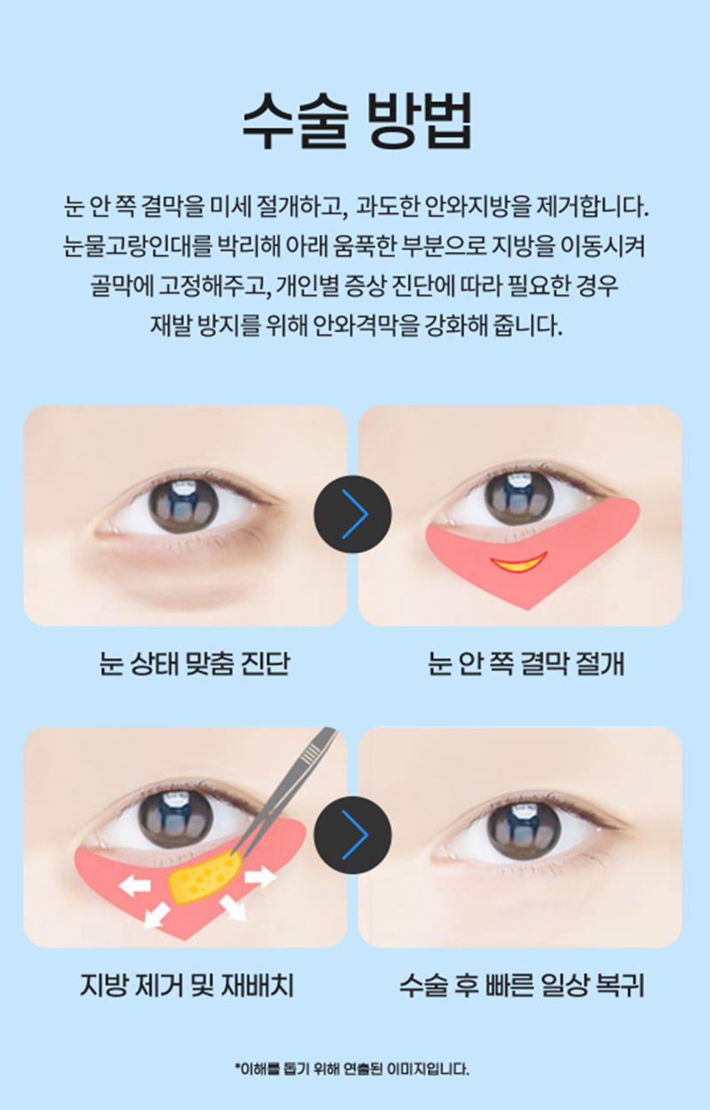 눈밑 지방, 꼭 수술이 필요할까요? 모든 눈밑 지방이 수술 대상은 아닙니다. 단순 그림자 문제인지, 지방 돌출인지, 꺼짐이 함께 있는지, 피부 탄력 상태는 어떤지 정확한 진단이 우선입니다. 이런 경우 상담을 고려해볼 수 있습니다. 1. 20~30대인데 눈밑이 항상 불룩해 보이는 경우 2. 다크서클이 점점 심해 보이는 경우 3. 화장으로도 커버가 어려운 경우 4. 사진에서 눈 아래 그림자가 심하게 나타나는 경우