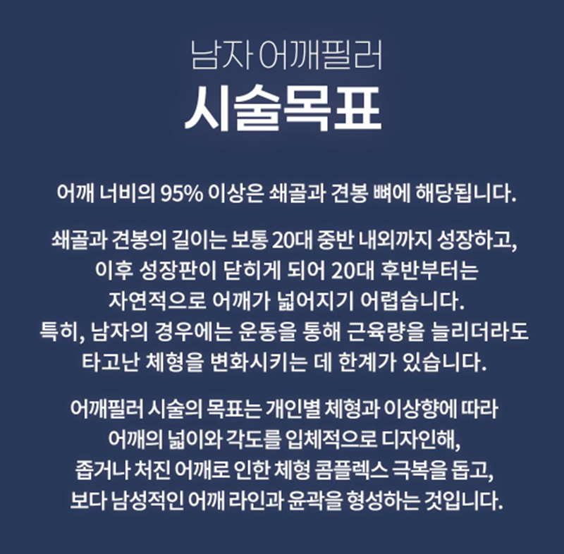 체형이 왜소해 보이는 이유, 남자 어깨필러가 답일까? “살은 빼지 않았는데 체형이 작아 보인다” “운동을 해도 상체가 넓어 보이지 않는다” 남성 체형 상담에서 자주 나오는 이야기입니다.실제로 체중이나 근육량과 관계없이 체형 비율과 어깨 라인에 따라 전체 인상이 크게 달라질 수 있습니다.오늘은 왜 체형이 왜소해 보이는지, 그리고 그 해결 방법 중 하나로 남자 어깨필러가 어떤 경우에 고려될 수 있는지 차분히 정리해 보겠습니다.왜 체형이 왜소해 보일까?체형이 작아 보이는 이유는 단순히 ‘마른 몸’ 때문만은 아닙니다. 대부분은 상체 비율과 어깨 구조에서 원인을 찾을 수 있습니다.1. 어깨 폭이 좁은 골격 구조: 타고난 쇄골 각도와 어깨뼈 위치에 따라 어깨 폭이 좁아 보일 수 있습니다. 이 경우 상체가 세로로 강조되어 체형이 더 슬림하게 인식됩니다.2. 승모근·삼각근 볼륨 부족: 운동을 하더라도 특정 근육 발달이 어려운 경우, 어깨의 ‘라인’이 살아나지 않아 체형이 왜소해 보일 수 있습니다.3. 어깨선이 아래로 처진 경우: 라운드 숄더, 자세 문제로 어깨선이 아래로 내려가면 상체 전체가 작아 보이는 인상을 줄 수 있습니다.남자 어깨필러, 어떤 경우에 고려할 수 있을까?남자 어깨필러는 단순히 “어깨를 키운다”는 개념보다는 체형 비율을 보완하는 목적으로 접근하는 것이 중요합니다.1. 운동으로도 어깨 라인 변화가 크지 않은 경우2. 체중 대비 상체 폭이 유독 좁아 보이는 경우3. 정면·측면 사진에서 어깨선이 꺼져 보이는 경우이처럼 골격적·구조적 한계가 있는 경우, 어깨필러는 하나의 선택지가 될 수 있습니다.남자 어깨필러의 핵심은 ‘과하지 않게’남성 어깨필러에서 가장 중요한 포인트는 티 나지 않는 자연스러운 라인입니다.인위적인 볼륨 강조, 과도한 어깨 각 형성, 체형, 어깨선, 상체 비율을 함께 고려해 정면·측면에서 안정적인 실루엣을 목표로 계획하는 것이 좋습니다.어깨를 ‘넓게 보이게’ 하기보다는 체형이 단단해 보이는 인상을 만드는 데 초점을 두는 것도 좋은 방법입니다.운동과 어깨필러, 대체 관계일까? 자주 받는 질문 중 하나입니다. 결론부터 말하면 대체 관계라기보다 보완 개념에 가깝습니다. 1. 운동: 근육량·체력·전반적인 체형 개선2. 어깨필러: 어깨선, 상체 비율, 실루엣 보완특히 단기간에 체형 인상을 개선하고 싶거나, 운동으로도 채워지지 않는 어깨 바깥 라인이 고민이라면 상담을 통해 적합성을 판단해볼 수 있습니다.남자 어깨필러 이런 분들에게는 신중해야 합니다.1. 어깨 비대칭이 심한 경우2. 어깨 통증이나 기능적 문제가 있는 경우3. 과도한 볼륨을 기대하는 경우따라서 시술 전에는 반드시 체형 분석과 충분한 상담이 선행되어야 하며 단순한 유행이나 이미지 변화만을 목적으로 결정하는 것은 권장되지 않습니다. 남자 어깨필러는 모든 사람에게 필요한 시술이 아니라, 특정 체형 고민을 가진 경우에 한해 고려될 수 있는 선택지 중 하나입니다. 중요한 것은 유행이 아니라 나에게 맞는 방향인지를 충분히 살펴보는 과정입니다. 체형과 어깨 라인에 대한 고민이 있다면 정보를 충분히 이해한 뒤 신중하게 판단해보시길 바랍니다. |
