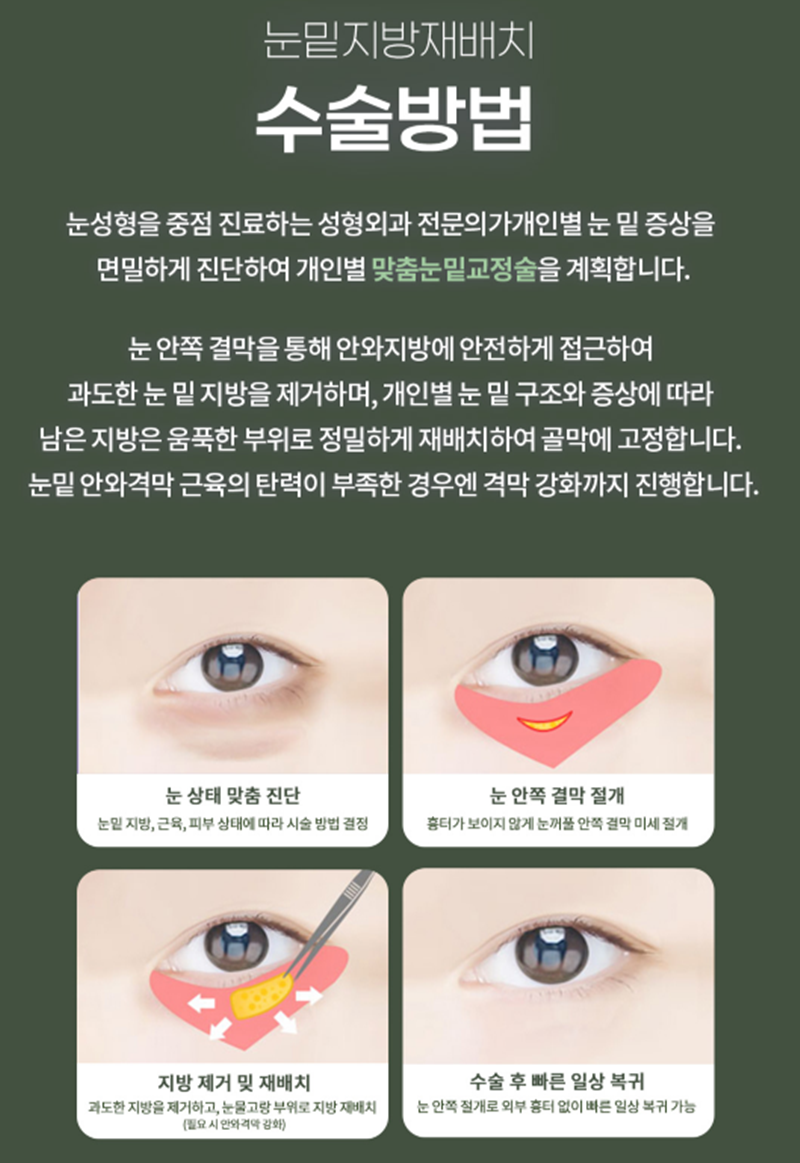 눈밑이 꺼져 보인다면? 눈밑지방재배치가 필요한 이유 거울을 볼 때마다 "잠을 못 잔 것 같아 보인다" "화장을 해도 눈밑이 칙칙하다"는 말을 자주 듣는다면 단순한 다크서클이 아니라 눈밑 지방 구조의 변화 때문일 수 있습니다. 눈밑은 얼굴에서 가장 피부가 얇고 노화가 빠르게 나타나는 부위인데요. 이 부위에 지방이 불균형하게 튀어나오거나, 반대로 꺼지면서 피곤하고 나이 들어 보이는 인상을 만들게 됩니다. 눈밑이 꺼져 보이는 진짜 원인은? 눈밑 꺼짐은 단순히 살이 빠져서 생기는 문제가 아닙니다. 1. 눈밑 지방이 앞으로 밀려 나오면서 아래쪽은 볼록 2. 지방 아래 고랑 부위는 상대적으로 꺼져 보이는 현상 3. 피부 탄력 저하로 음영이 더 짙어 보이는 경우 이런 경우, 눈밑 지방을 단순히 제거만 하면 오히려 더 꺼져 보이거나 노안 인상이 심해질 수 있습니다. 눈밑지방재배치란? 눈밑지방재배치는 불필요하게 튀어나온 지방은 정리하고, 꺼진 부위로 고르게 재배치해 눈밑을 매끈하게 만들어주는 수술입니다. 튀어나온 눈 밑 -> 평평하게 자연스럽게 꺼진 고랑 -> 볼륨을 채워 부드러운 인상으로 인위적이지 않은 동안 효과까지 눈밑지방재배치가 필요한 경우는? 다음과 같은 경우라면 눈밑지방재배치를 고려해볼 수 있습니다. 1. 눈밑이 불룩하면서 아래는 꺼져 보이는 경우 2. 다크서클이 회장으로도 잘 가려지지 않은 경우 3. 눈 밑 고랑 때문에 실제 나이보다 들어 보이는 경우 4. 단순 지방제거로는 개선이 어려운 구조인 경우 특히 눈밑 꺼짐 + 돌출이 함께 있는 경우에는 지방재배치가 더 자연스러운 선택이 될 수 있습니다.