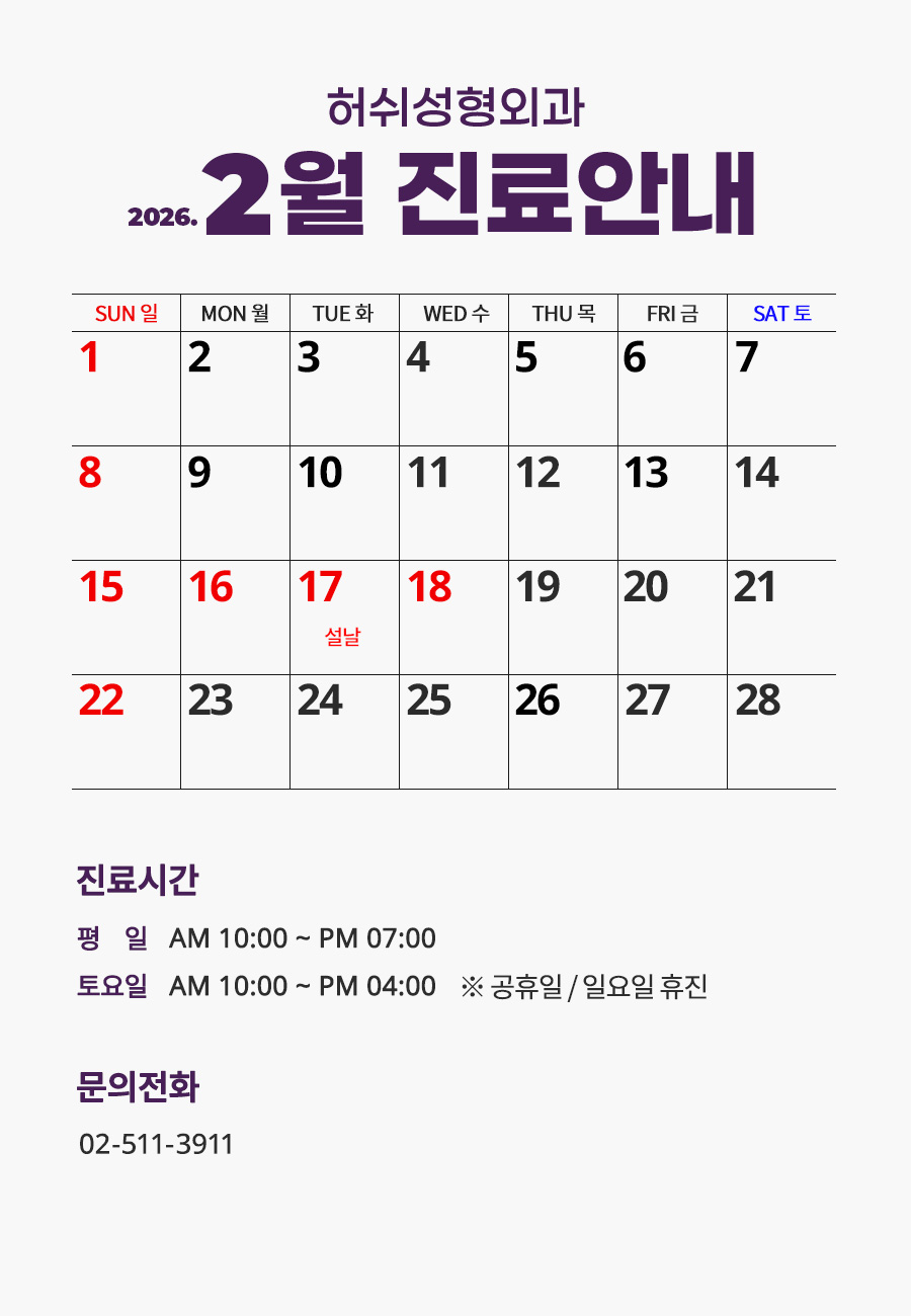[허쉬성형외과] 2026년 2월 진료일 안내 2026-01-27 hit.131 |