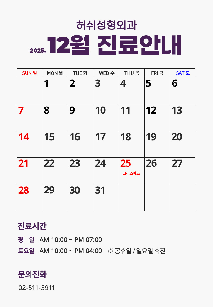 [허쉬성형외과] 2025년 12월 진료일 안내